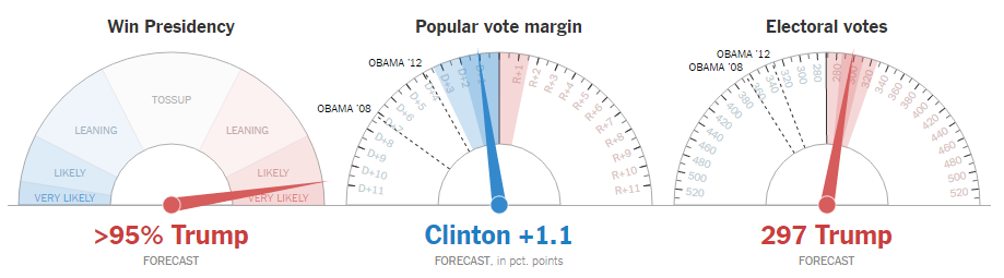 With key swing states Florida and Ohio falling to Trump the New York Times is gauging the probability of a Trump win at more than 95% (a virtual certainty that he will be the next US President at this point):