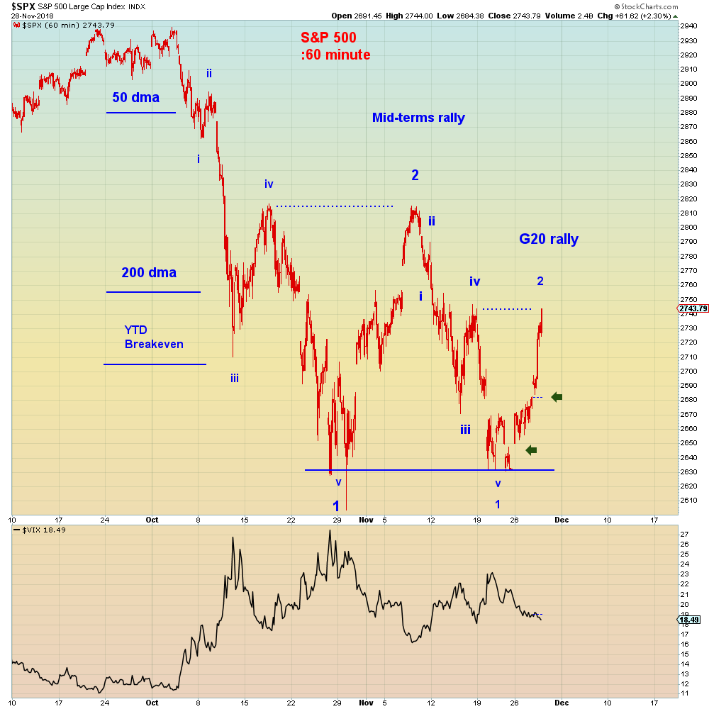 Here is a potential wave count. For those who don’t subscribe to Elliott Wave Theory, regardless the symmetry between the two fractals is uncanny. Both “v” wave downs had large overnight gaps. Both wave “2” retracements have large upside gaps. The only open gaps are all below today’s close.