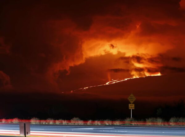 Lava flows from a vent at 12,000ft elevation downslope to about 8,000 ft elevation in the saddle area between mountains.