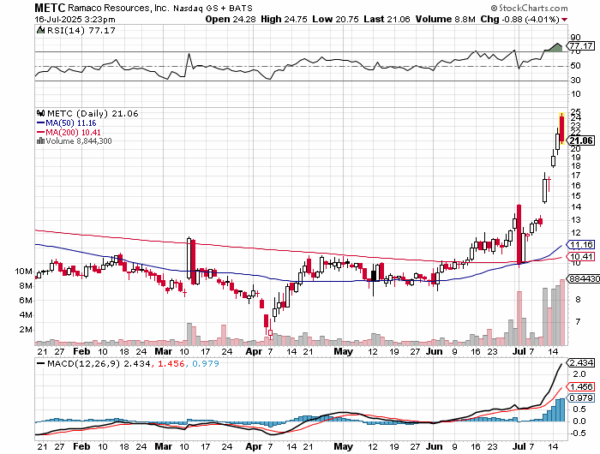 Metc is currently active and might be in a next move up after a golden cross after moving back to support which is in the range of the 50 and 200 MA where you could draw the final support line around the 200 MA. There has been a definite pattern following each cross and support at 200 MA before a higher move.