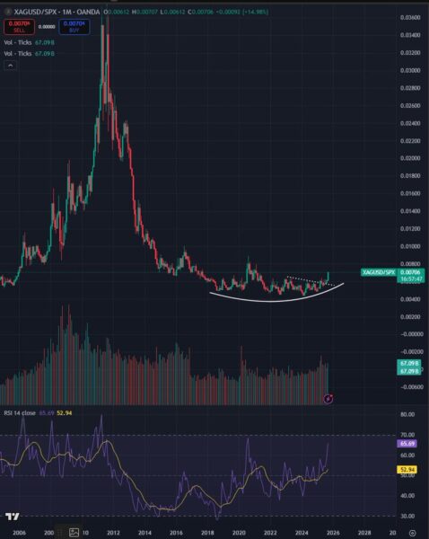 just in case you for some retarded reason think you might be late to the silver trade, here is silver against the sp500