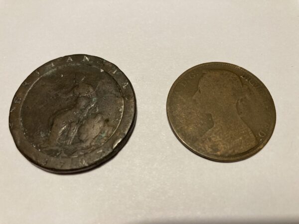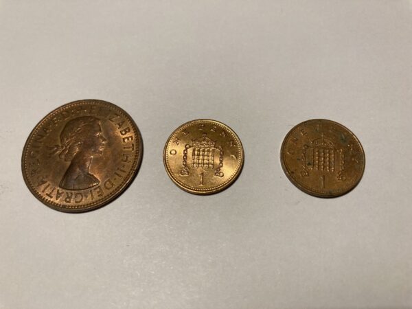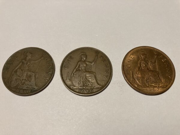 Top left is the 1797 “Cartwheel” penny. Worth its weight in copper, 1 oz at the time. Now worth about 30 US cents, copper value. One penny = 1 oz copper. Called a cartwheel, ‘cos it was very heavy. “Pocket buster” might have been more appropriate. Top right is a mid-nineteenth century Victorian penny at 9gm, a third of an ounce, very worn because it too is pure copper. You can see how much thinner than the cartwheel it is. The next three are bronze pennies, also a third of an ounce, copper with a hint of tin to give hardness, so they aren’t so worn. Bottom left is the obverse of the 1967 penny, the last pre-decimal one. Bottom middle is a 1986 decimal bronze penny, worth 2.4 of the penny on its left ….. which it replaced in 1971.